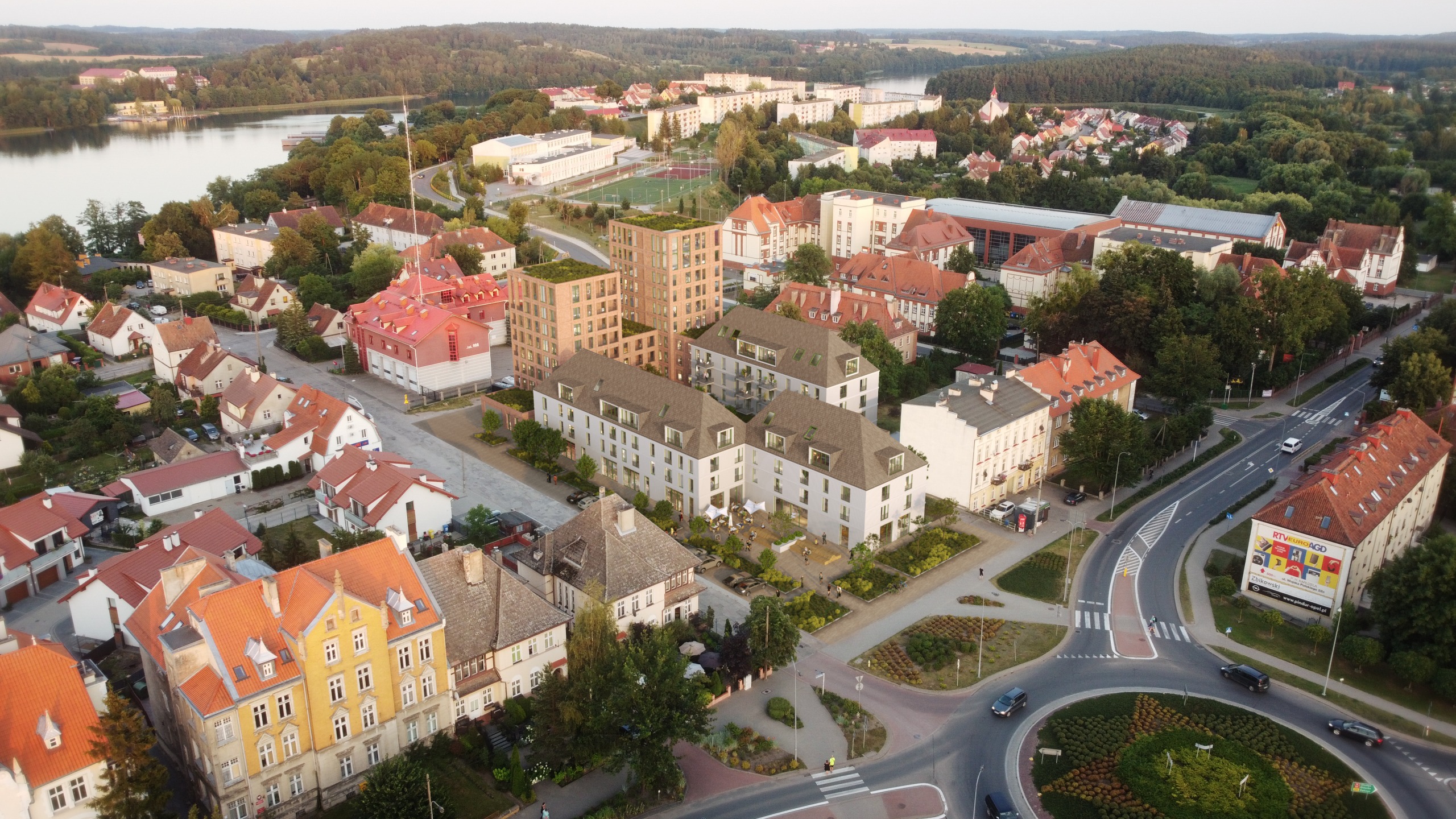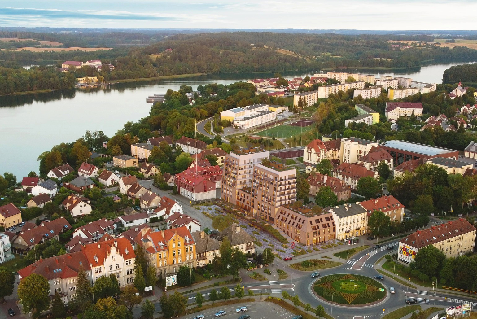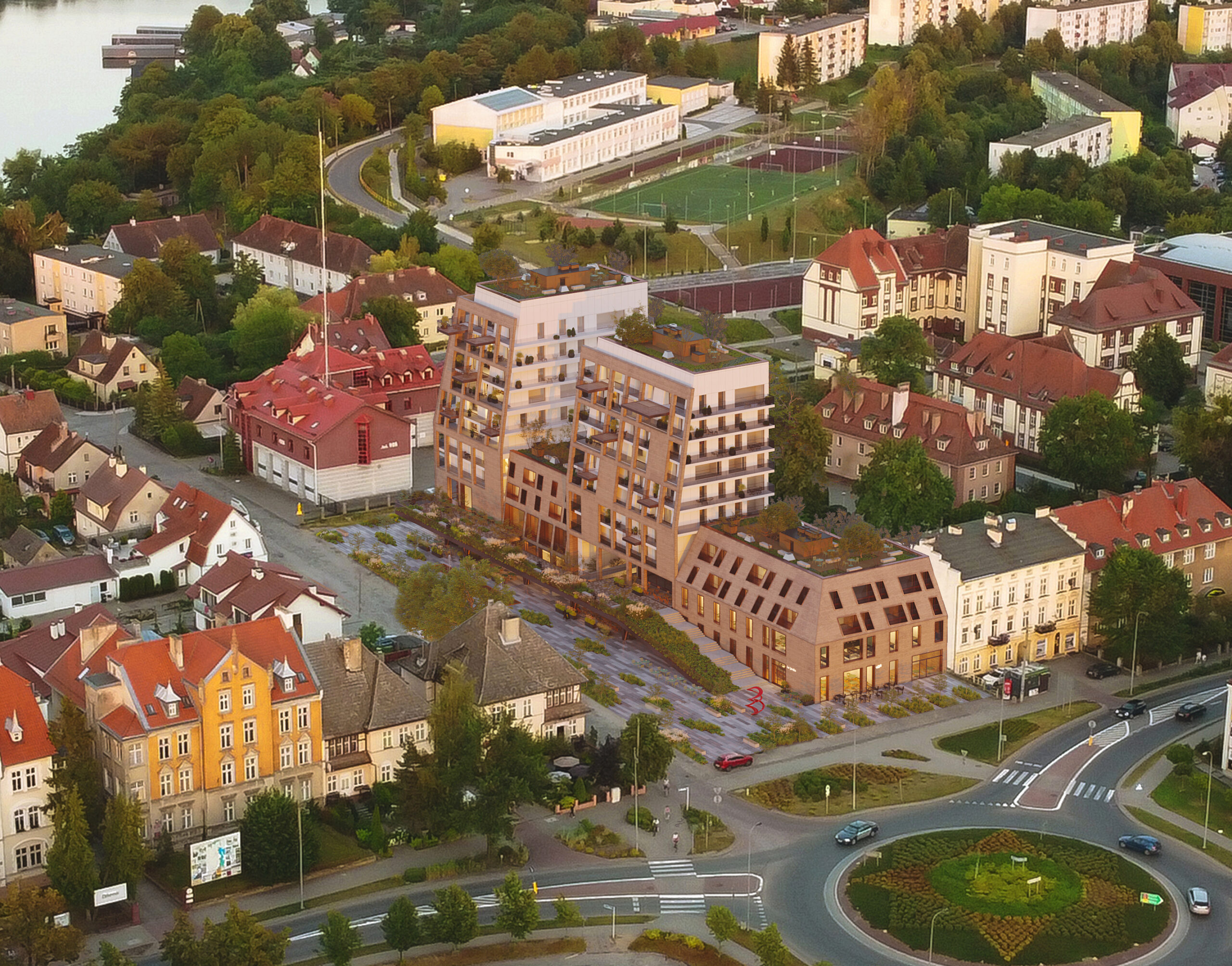 Po wielu wariantach i analizach powstał śmiały projekt budynków 10-cio kondygnacyjnych w Mrągowie. Projekt trudny z uwagi na lokalizację oraz szczególny lokalny charakter miejsca. Projekt w założeniu ma zachować klimat Mrągowa, jednocześnie wpisać się w tkankę miasta nie dominując przestrzeni, a ją wzbogacając o nowe walory. Jest to trudne zadanie z punktu widzenia projektowania nowoczesnej Architektury w tak charakterystycznym miejscu. Projektowana koncepcja, mimo nawiązań do lokalnej architektury, nie ma udawać historycznych obiektów. Ma mieć jednoznacznie współczesny charakter odpowiadając na obecne funkcjonalne potrzeby. Zastosowano 2 podstawowe materiały, które przekładają się na 2 elementy w tworzeniu całości budynku są to: cegła oraz biała elewacja. Kontrast tych dwóch kolorów zauważalny jest w całym mieście. Cegła jest również często używanym materiałem w okolicy. Projekt ucieka od dosłowności i budowy kamieniczek w XXI wieku. Elewacje budynków niskich kształtowane są w całości z klinkieru. Ściany, pochyłe ściany, umowne dachy są z jednego materiału upraszczając w ten sposób formę kamieniczek unikając dosłowności. Budynki wysokie są rozwinięciem tego pomysłu elewacje z klinkieru pochylają się oraz stają się ażurowe nadając lekkości wysokim częściom budynku nawiązując jednocześnie charakterem do muru pruskiego. Elewacja ceglana zamyka w sobie, opakowuje, białe bryły ukazując je dopiero na wyższych kondygnacjach. Koncepcja oparta została o założenia planu miejscowego. Podstawowymi i najważniejszymi celami projektu było:- wpisanie w otoczenie projektowanych budynków wysokich tak aby nie zakłócając charakteru miejsca stworzyć współczesną Architekturę;- uatrakcyjnienie tej części miasta poprzez stworzenie dodatkowego placu publicznego, z kawiarniami i różnymi usługami, dostępnego dla mieszkańców.