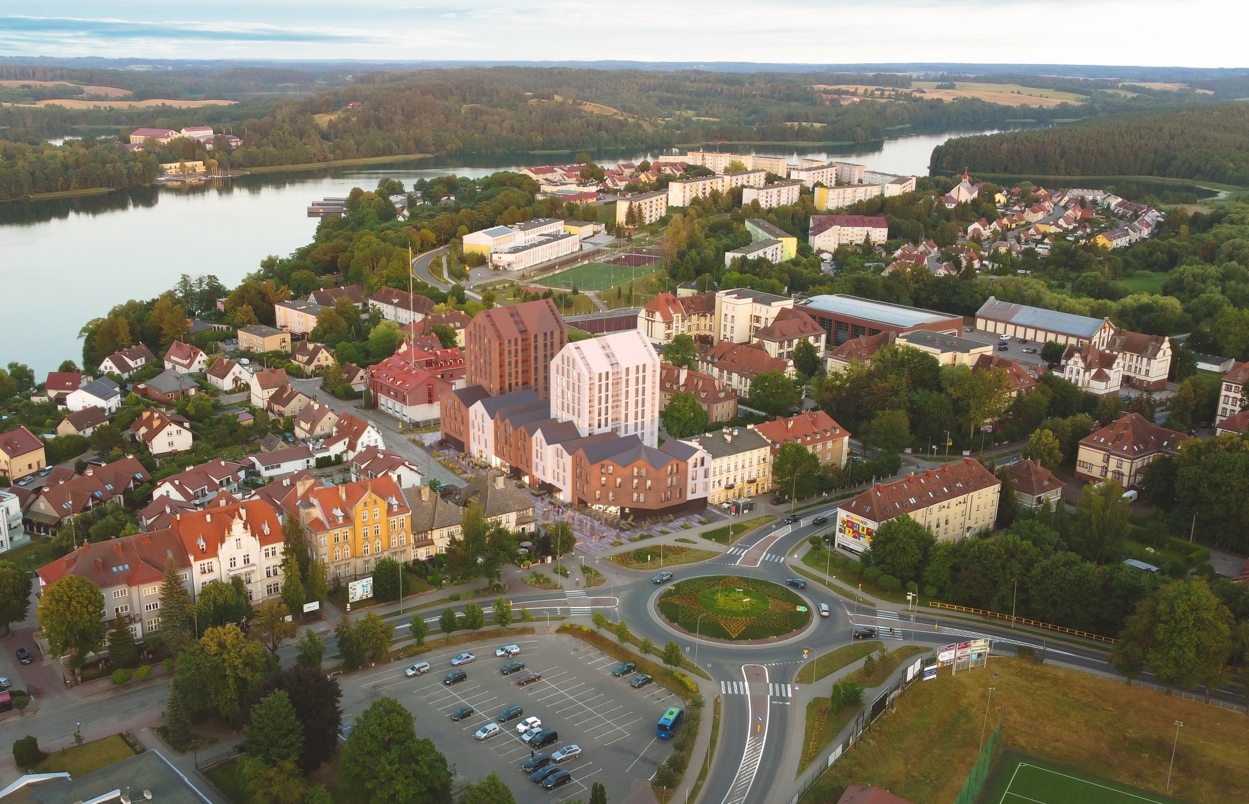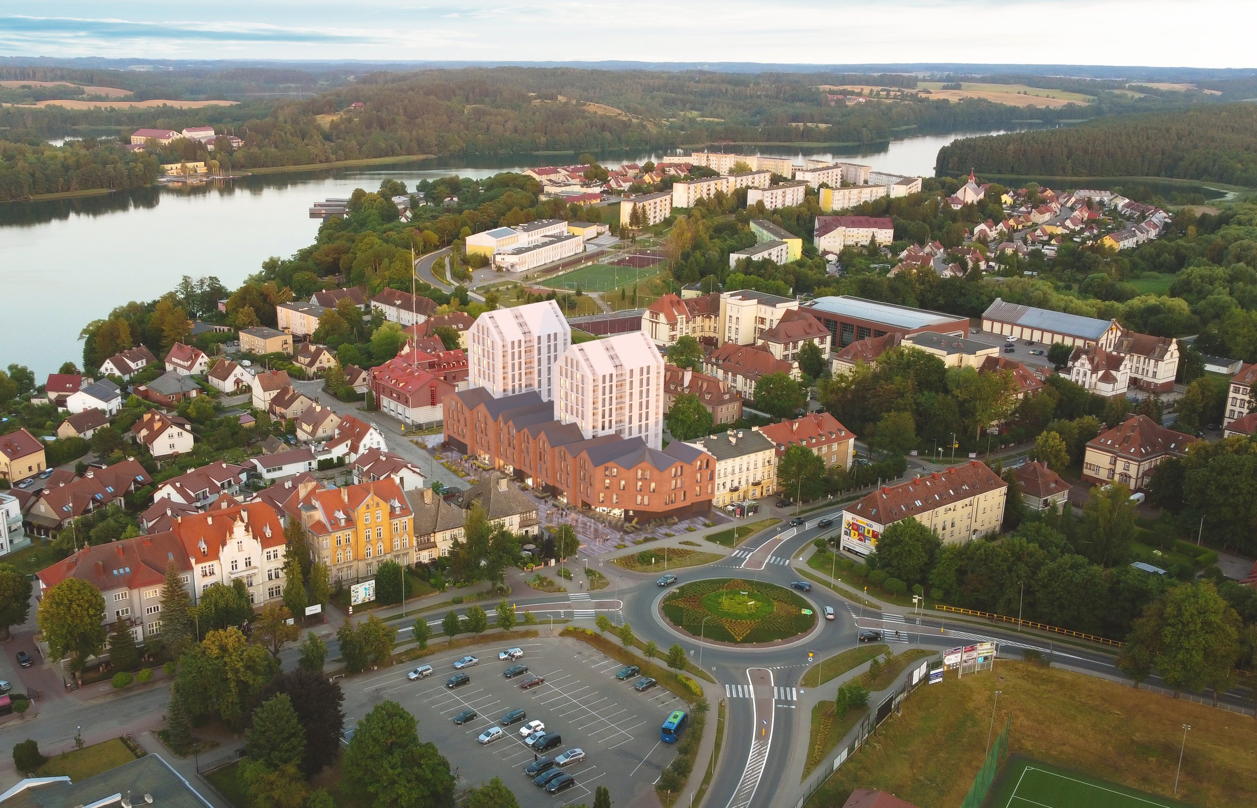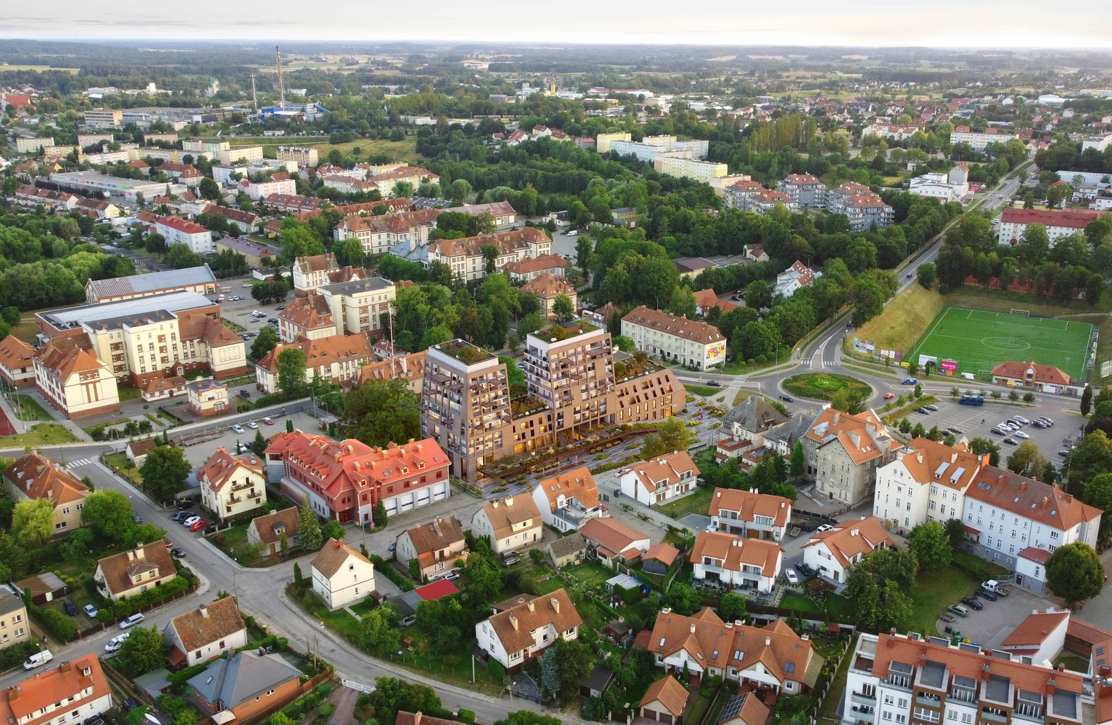 Po wielu wariantach i analizach powstał śmiały projekt budynków 10-cio kondygnacyjnych w Mrągowie. Projekt trudny z uwagi na lokalizację oraz szczególny lokalny charakter miejsca. Projekt w założeniu ma zachować klimat Mrągowa, jednocześnie wpisać się w tkankę miasta nie dominując przestrzeni, a ją wzbogacając o nowe walory. Jest to trudne zadanie z punktu widzenia projektowania nowoczesnej Architektury w tak charakterystycznym miejscu. Projektowana koncepcja, mimo nawiązań do lokalnej architektury, nie ma udawać historycznych obiektów. Ma mieć jednoznacznie współczesny charakter odpowiadając na obecne funkcjonalne potrzeby. Zastosowano 2 podstawowe materiały, które przekładają się na 2 elementy w tworzeniu całości budynku są to: cegła oraz biała elewacja. Kontrast tych dwóch kolorów zauważalny jest w całym mieście. Cegła jest również często używanym materiałem w okolicy. Projekt ucieka od dosłowności i budowy kamieniczek w XXI wieku. Elewacje budynków niskich kształtowane są w całości z klinkieru. Ściany, pochyłe ściany, umowne dachy są z jednego materiału upraszczając w ten sposób formę kamieniczek unikając dosłowności. Budynki wysokie są rozwinięciem tego pomysłu elewacje z klinkieru pochylają się oraz stają się ażurowe nadając lekkości wysokim częściom budynku nawiązując jednocześnie charakterem do muru pruskiego. Elewacja ceglana zamyka w sobie, opakowuje, białe bryły ukazując je dopiero na wyższych kondygnacjach. Koncepcja oparta została o założenia planu miejscowego. Podstawowymi i najważniejszymi celami projektu było:- wpisanie w otoczenie projektowanych budynków wysokich tak aby nie zakłócając charakteru miejsca stworzyć współczesną Architekturę;- uatrakcyjnienie tej części miasta poprzez stworzenie dodatkowego placu publicznego, z kawiarniami i różnymi usługami, dostępnego dla mieszkańców.
