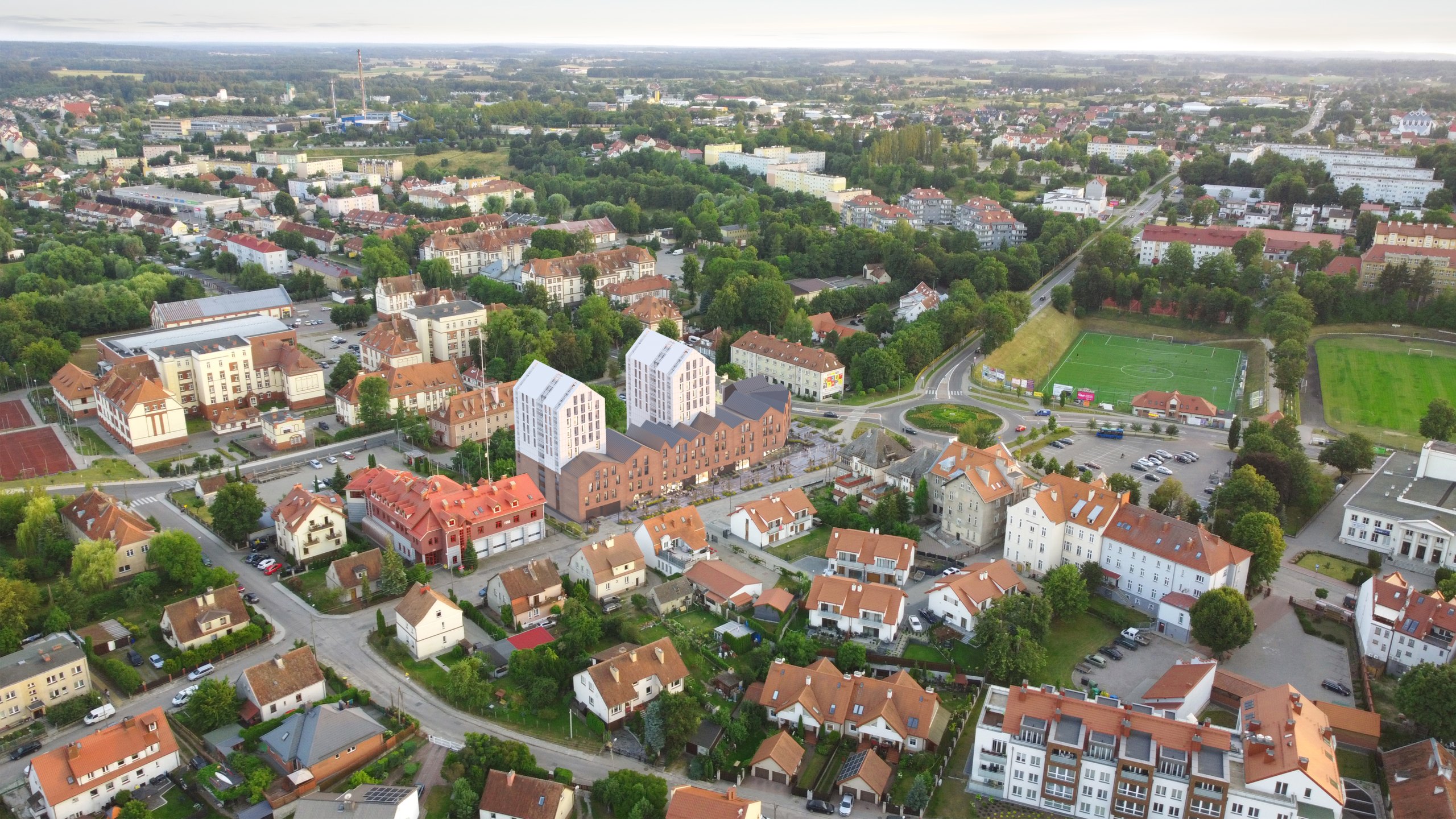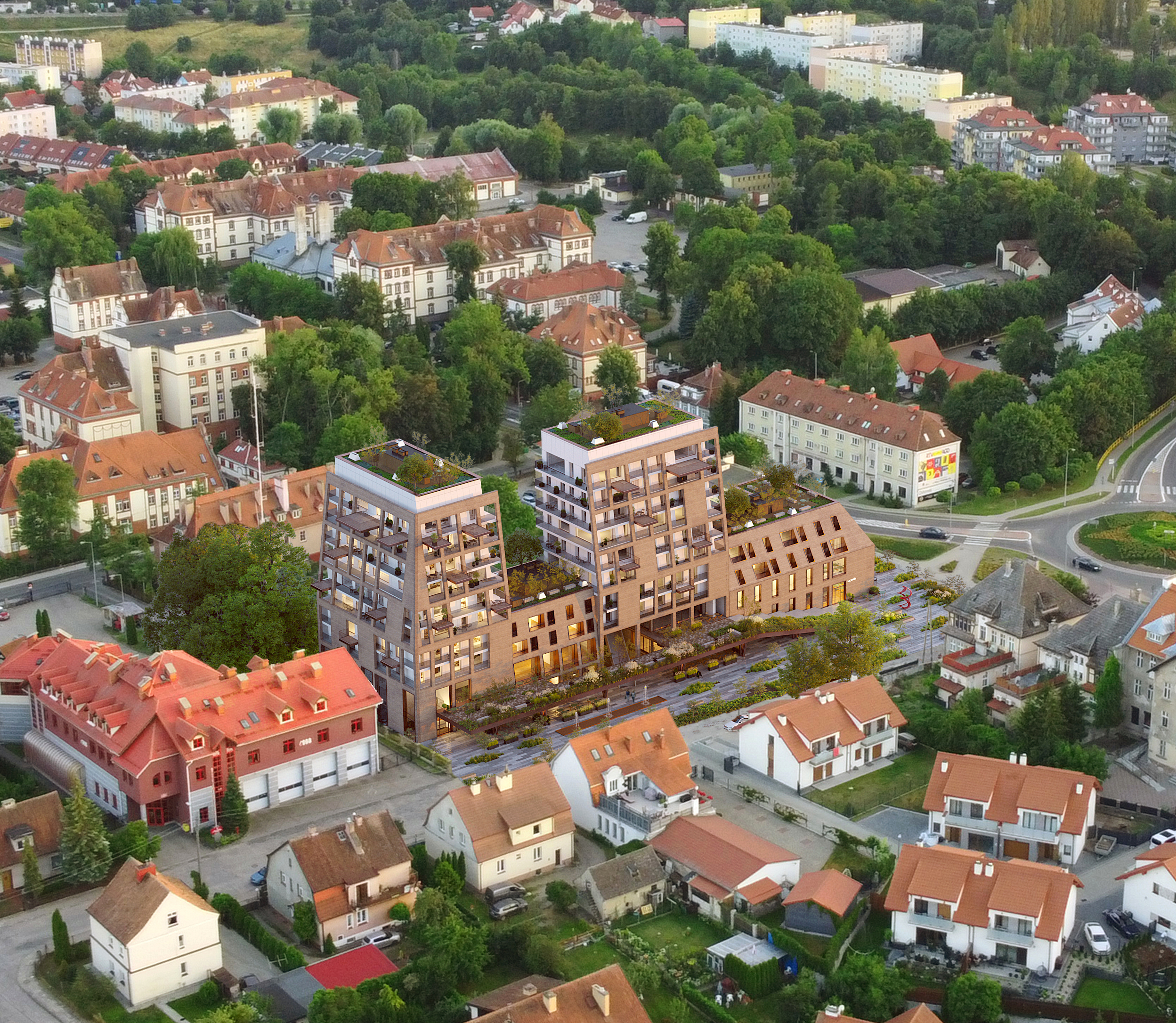 Są to: 4-kondygnacyjna bryła powiązana z ulicą oraz wycofane dwie 10-cio kondygnacyjne bryły.