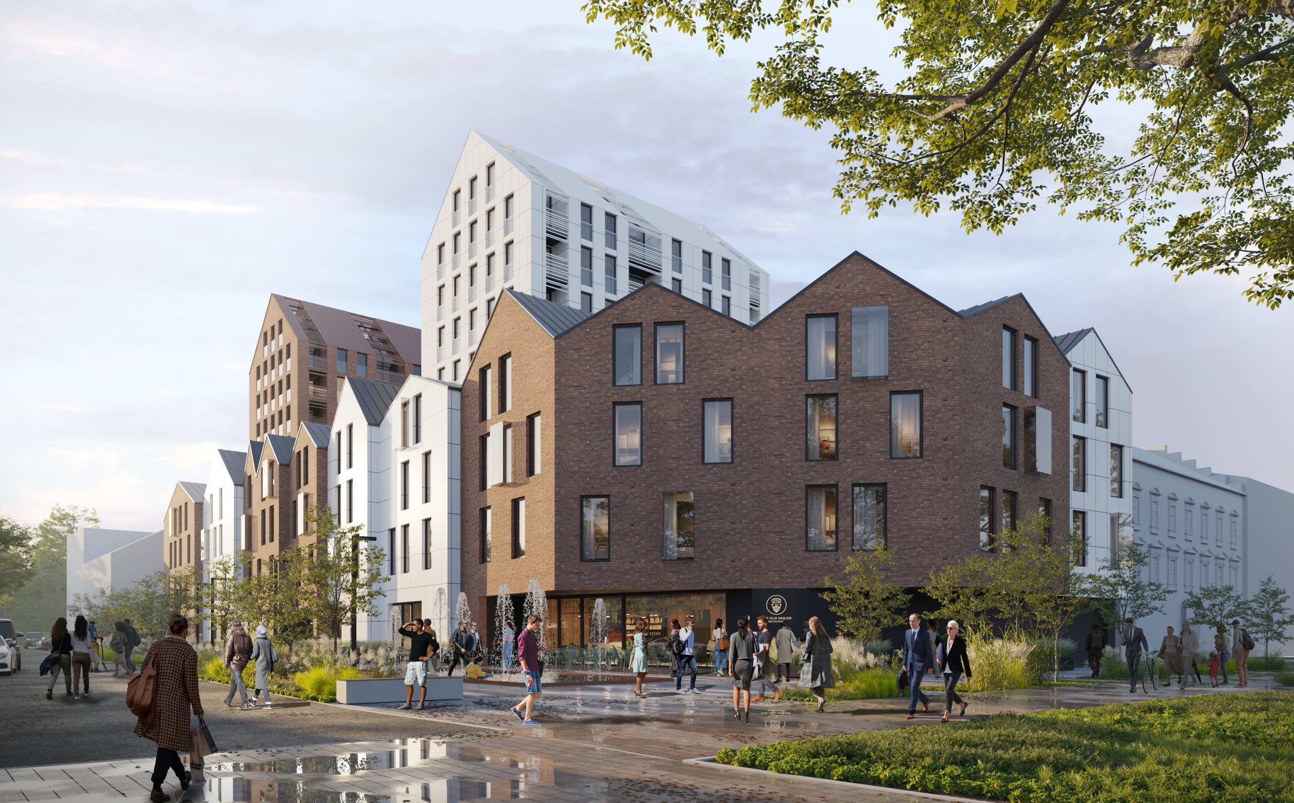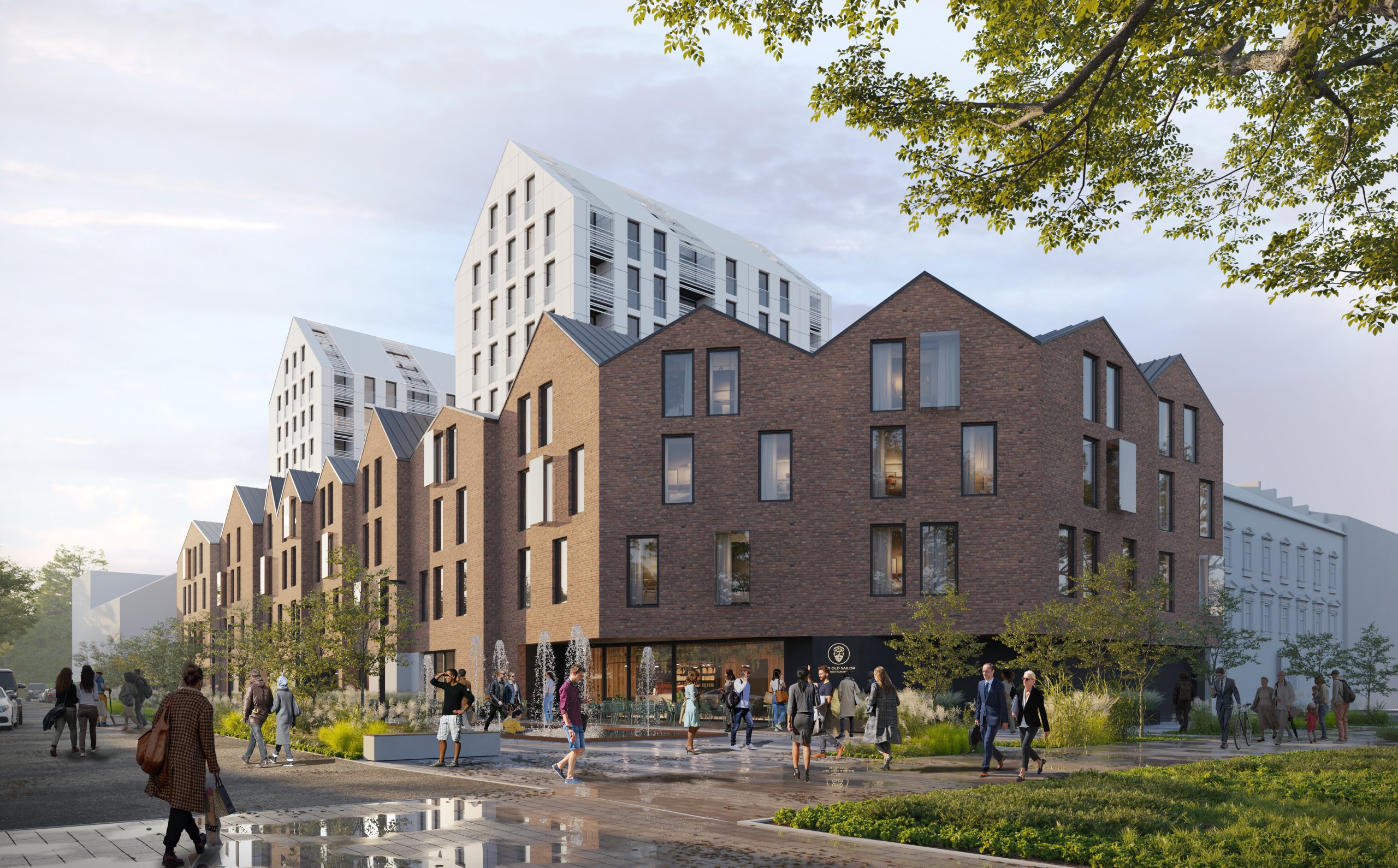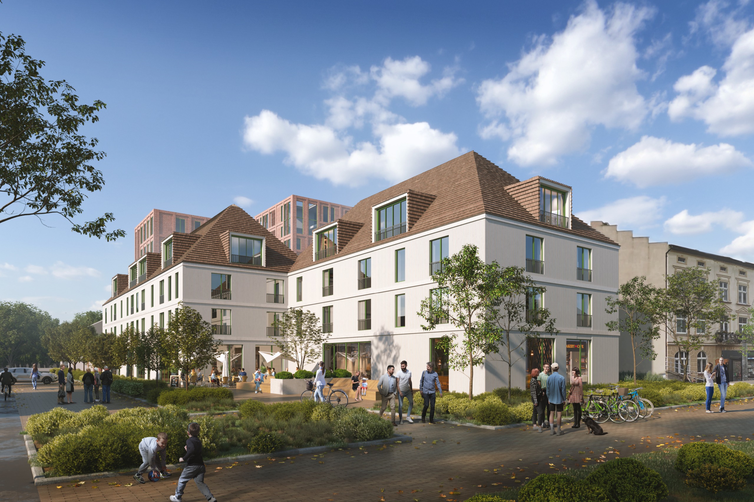 Koncepcja oparta jest na klasycznym podjęciu do zabudowy kamicowej. Zaproponowano budynki wielorodzinne z usługami i biurami przekryte dachami spadzistymi nawiązującymi do najbliższej okolicy. Koncepcja składa się z dwóch elementów podkreślonych bryłą oraz materiałem.